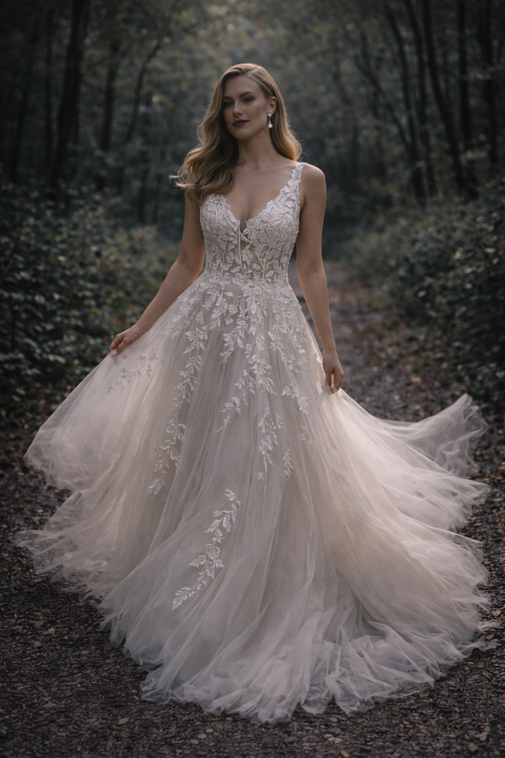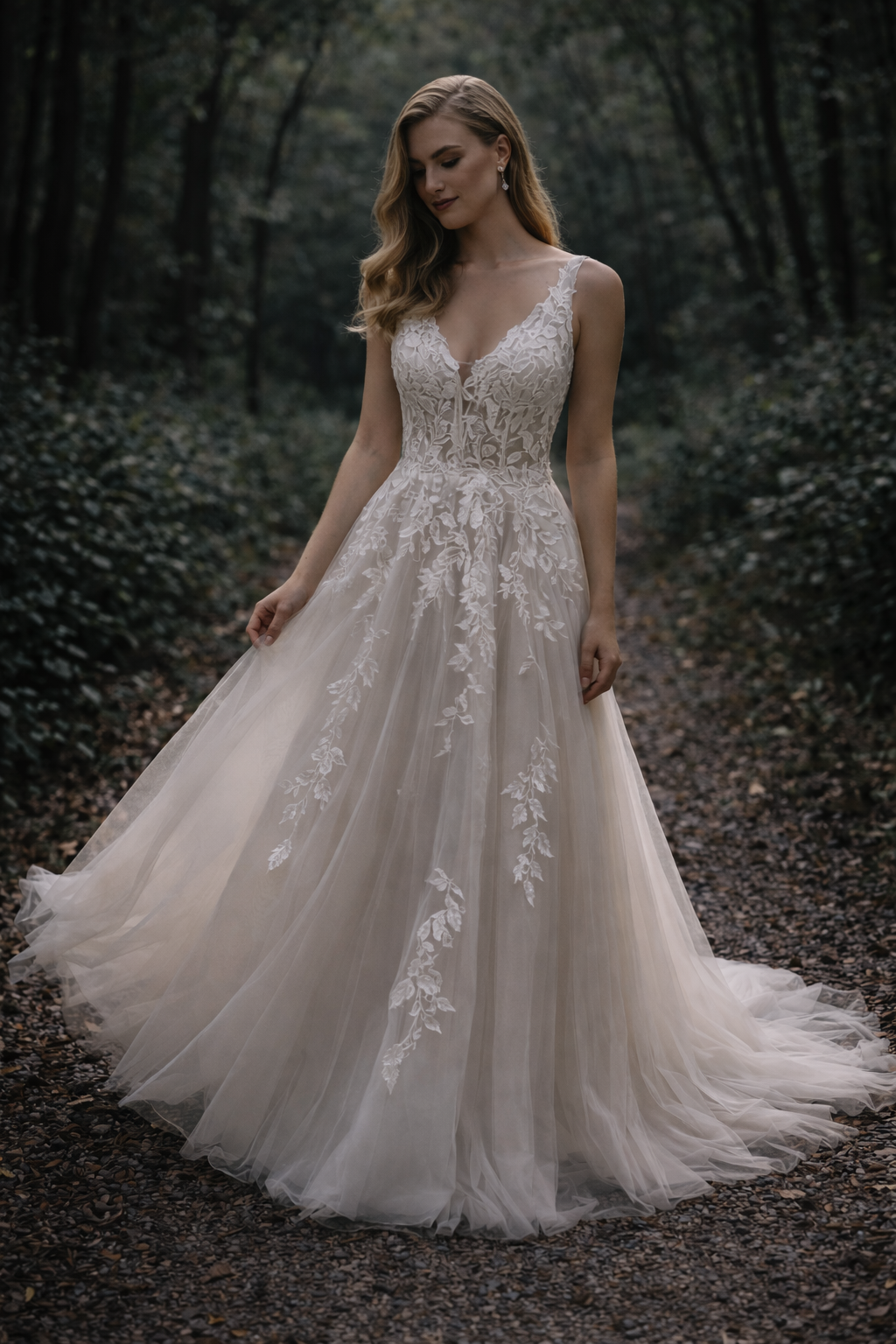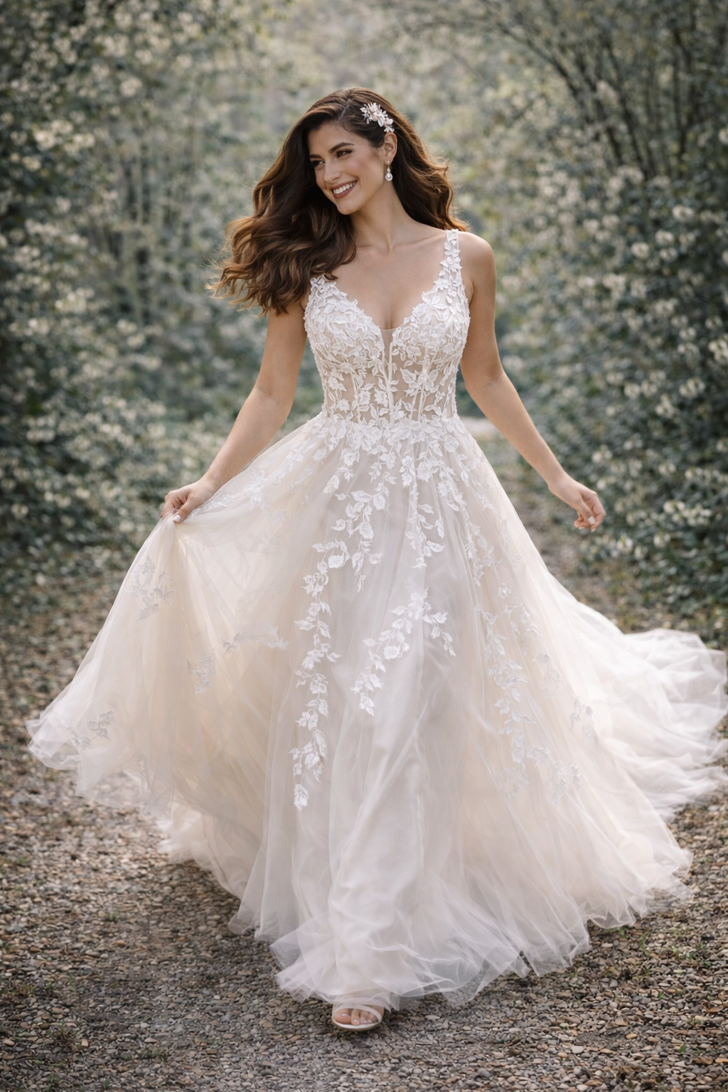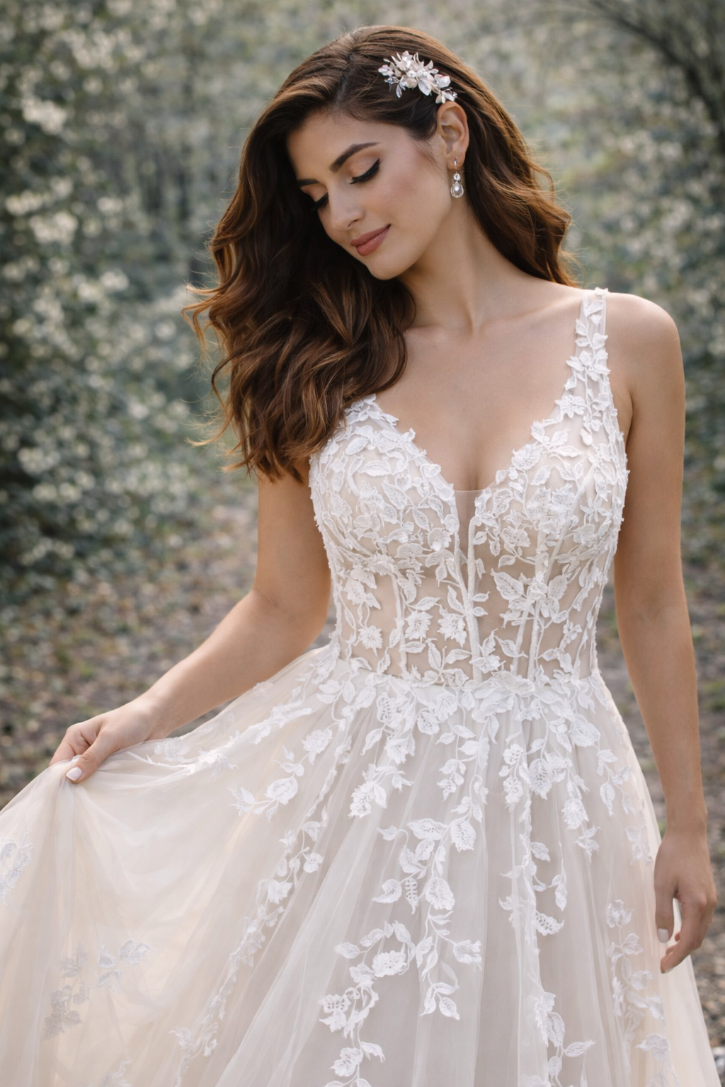 This romantic V-neck wedding gown is designed to capture soft elegance and effortless movement. The fitted bodice features a delicate neckline with fine floral lace appliqué that gently frames the shoulders and highlights the natural shape.