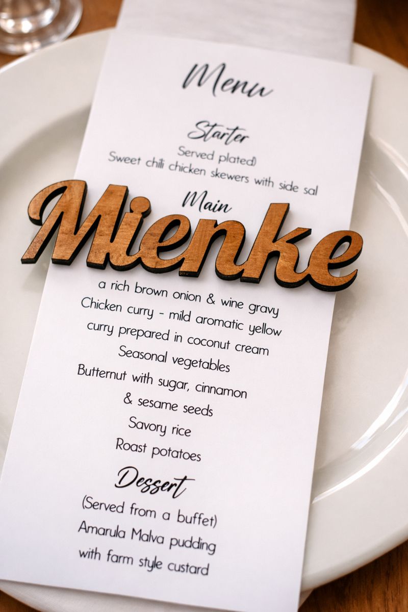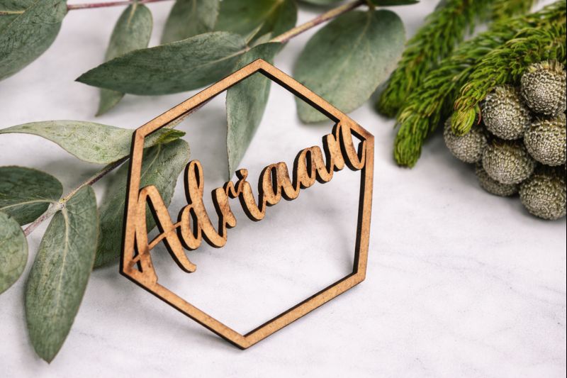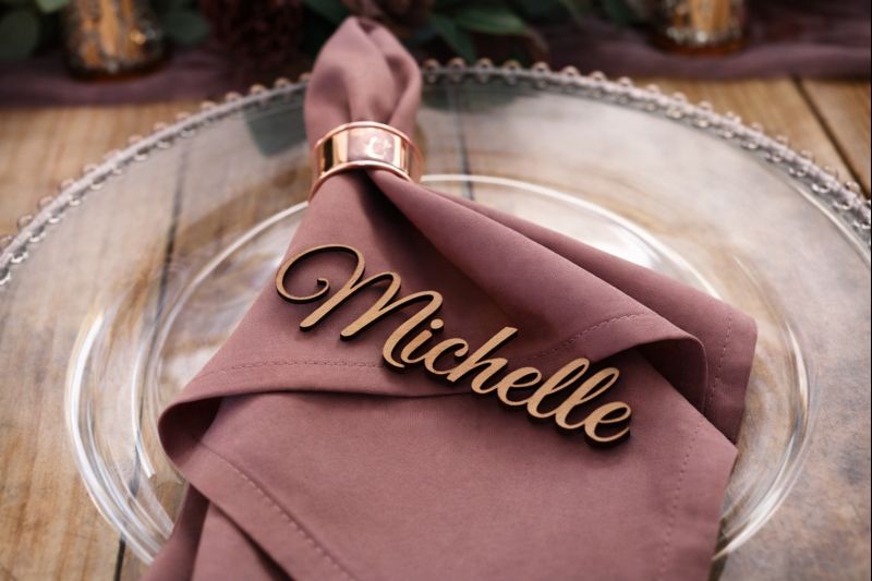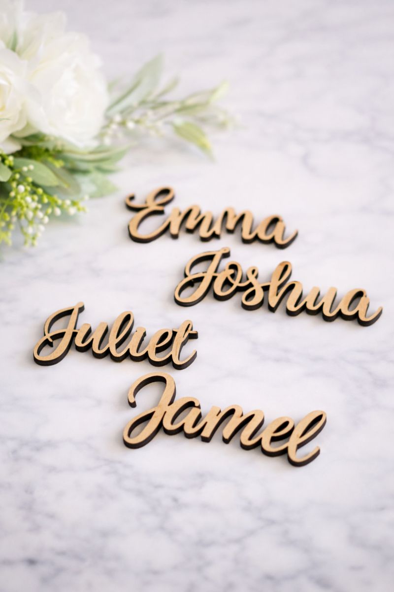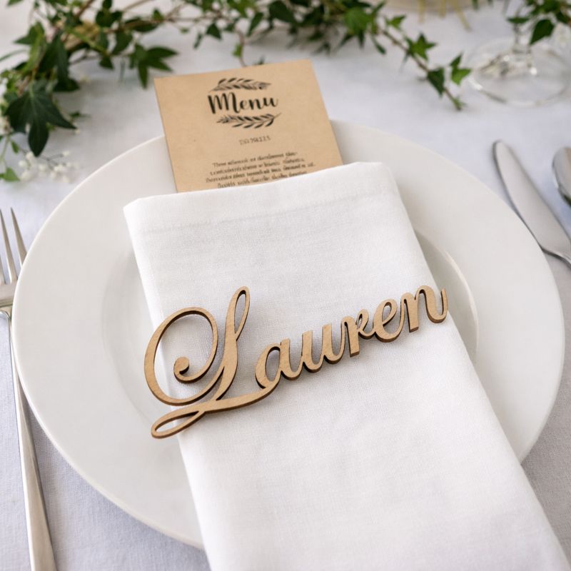 Our guest name cut-outs are precision laser-cut from wood and customised with each guest’s name. These versatile pieces can be placed directly on plates, menus, napkins or incorporated into table décor and styling.
