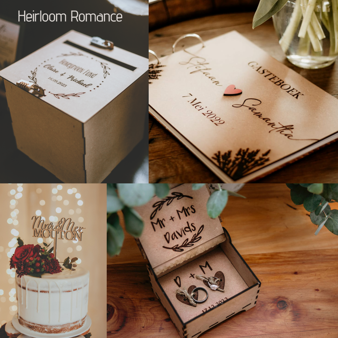 The Heirloom Romance Collection brings together meaningful wedding keepsakes designed to honour your love story in the most personal way. Crafted from wood and perspex with delicate engraving details, each piece is made to be more than décor — it’s a memory preserved.