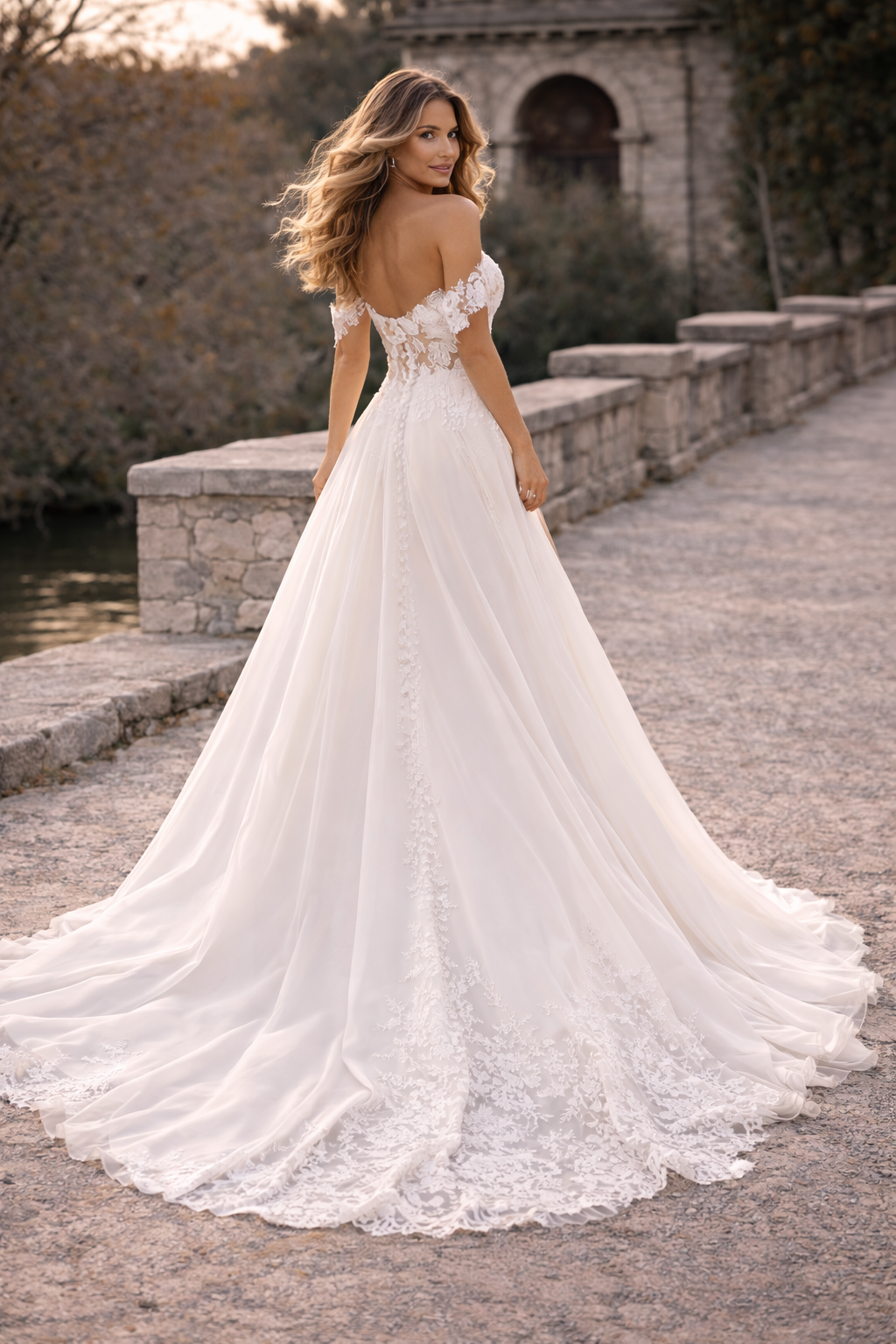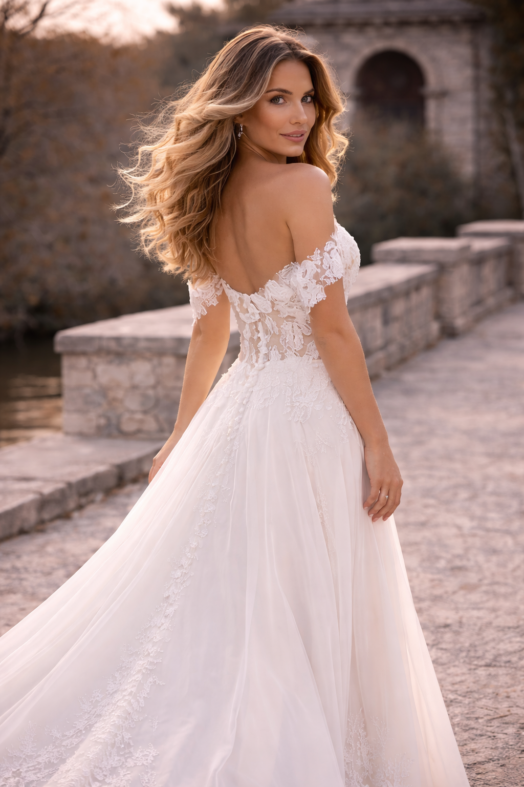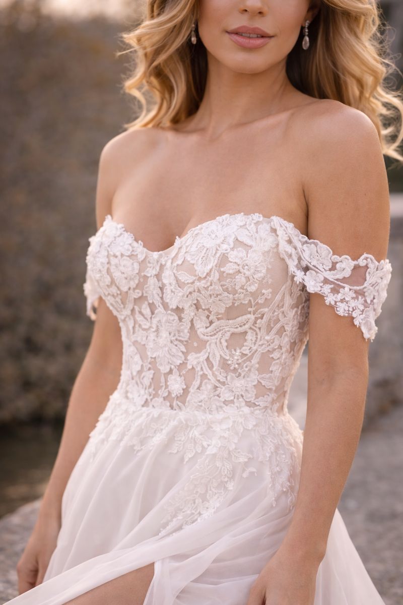 This romantic off-the-shoulder wedding gown blends soft femininity with modern allure. The fitted bodice features a delicate sweetheart neckline with sheer illusion lace, beautifully adorned with intricate floral appliqué that creates a light, sculpted silhouette.