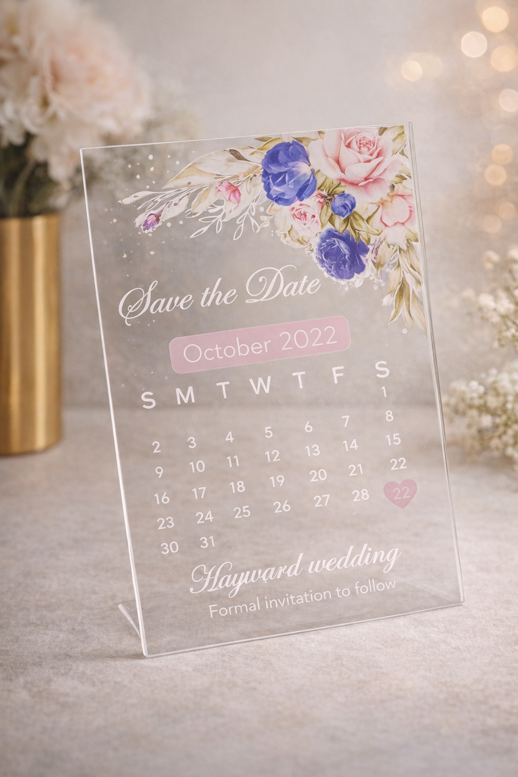 Make your wedding date unforgettable with our modern Acrylic Save the Date Calendar. Crafted from clear perspex and personalised with your names and chosen date, this elegant keepsake doubles as both an announcement and a lasting memory.
