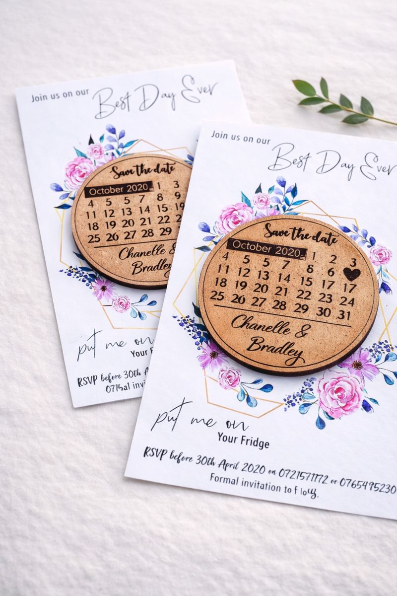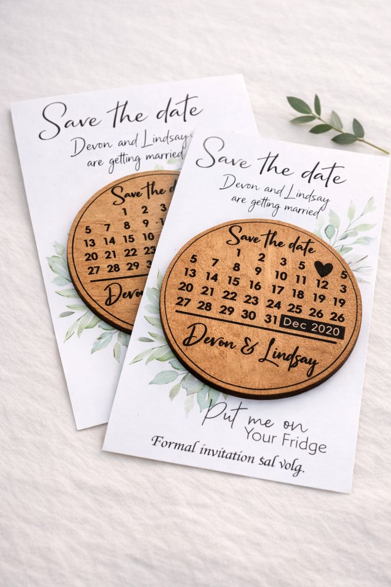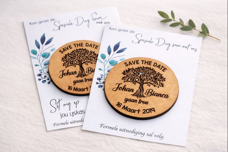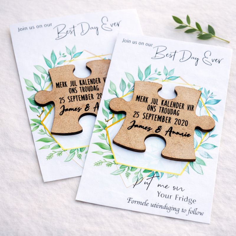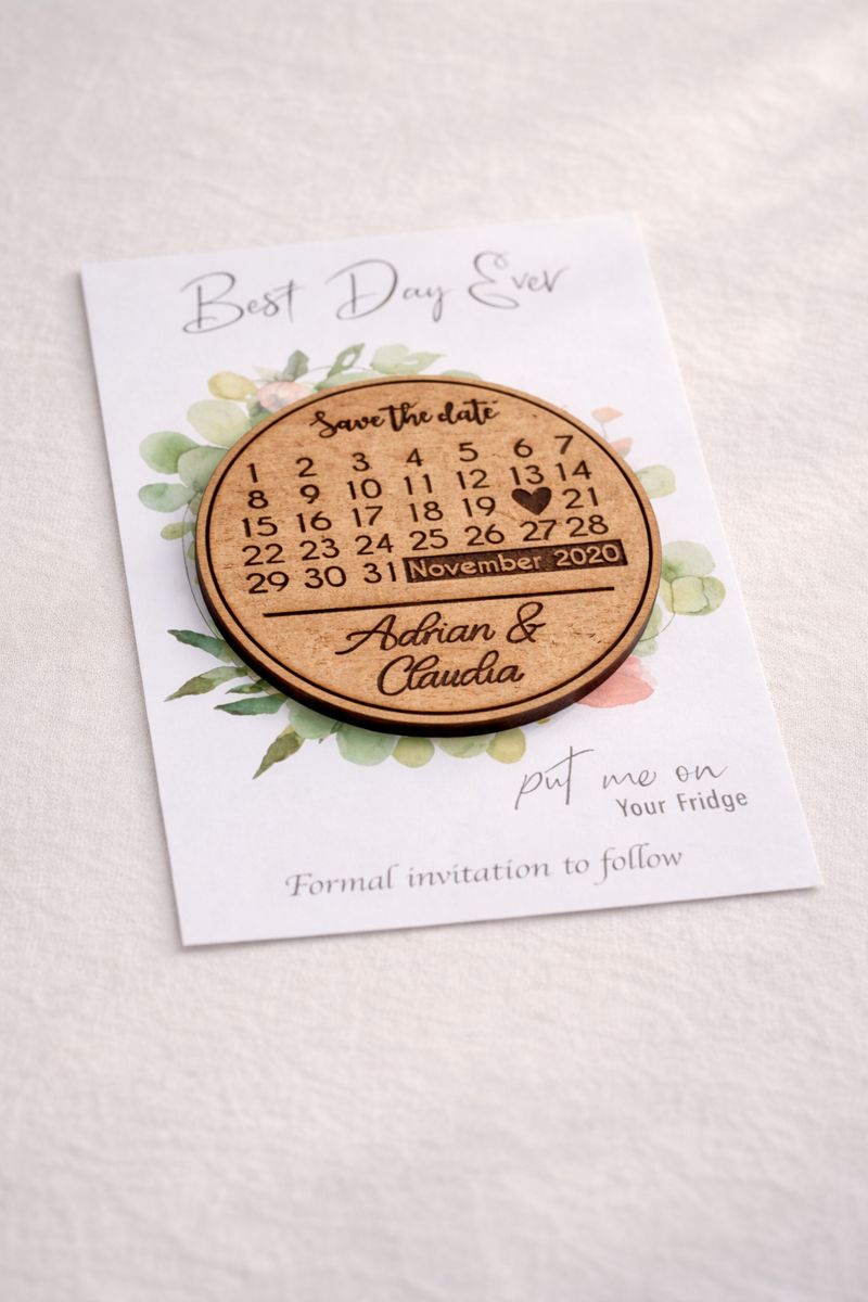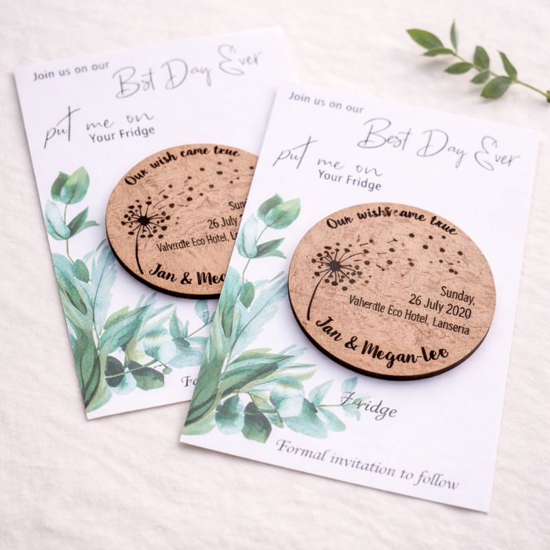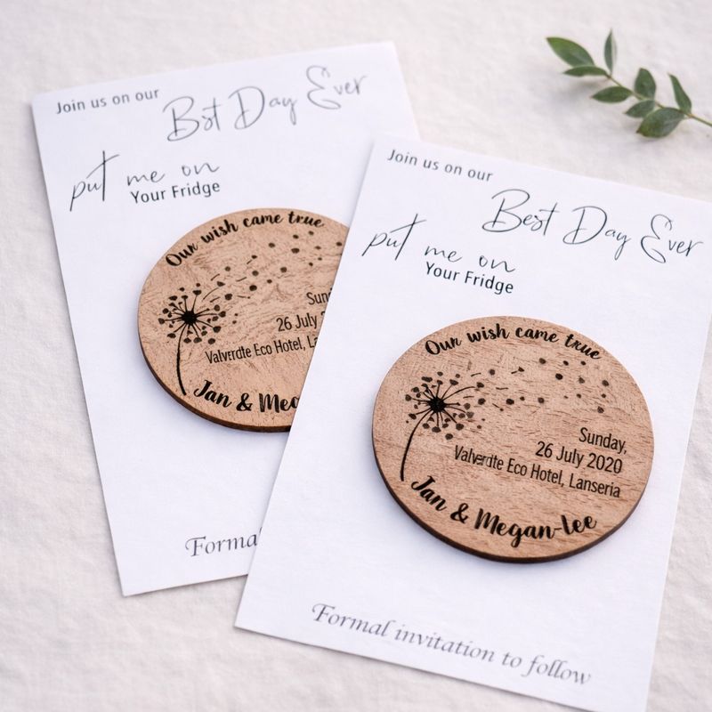 Each set includes a wooden engraved magnet mounted onto a printed card, making it easy for guests to display your date on their fridge or notice board while they wait for the formal invitation.